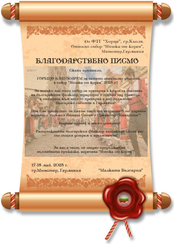 Моменти от участието на ФТГ "Хорце" на V-ия фолклорен събор "Нишка от корен", организиран от сдружение Малката България в Мюнстер